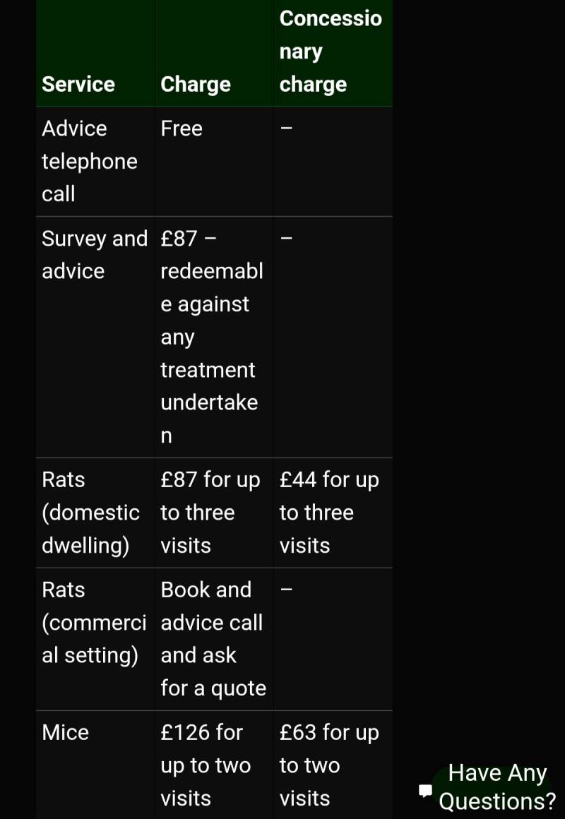 The picture below is one typical set of charges that a local council may charge for their pest control services.